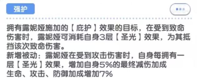 露妮娅五星觉醒的第二个机制是加了个最终减伤,数值是【圣光】层数×5%