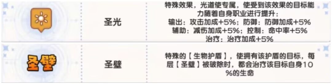 [圣光]效果是光道使专属的增益加成,不同职业加成不同,由于露妮娅是防御职业少女,所以给她的加成是防御+5%,也是十分契合露妮娅呢。