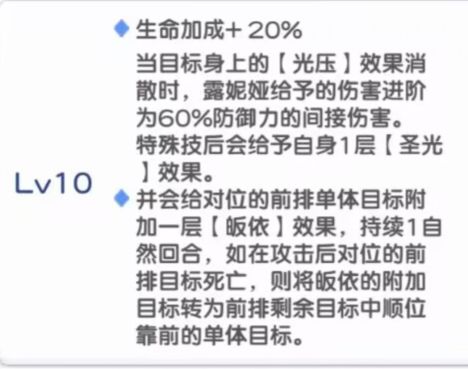 当目标身上的[光压]效果消散时,露妮娅给予的伤害进阶为60%防御力的间接伤害。特殊技后会给予自身1层[圣光]效果。,并会给对位的前排单体目标附加一层[皈依]效果,持续1自然回合,如在攻击后对位的前排目标死亡,则将皈依的附加目标转为前排剩余目标中顺位靠前的单体目标。