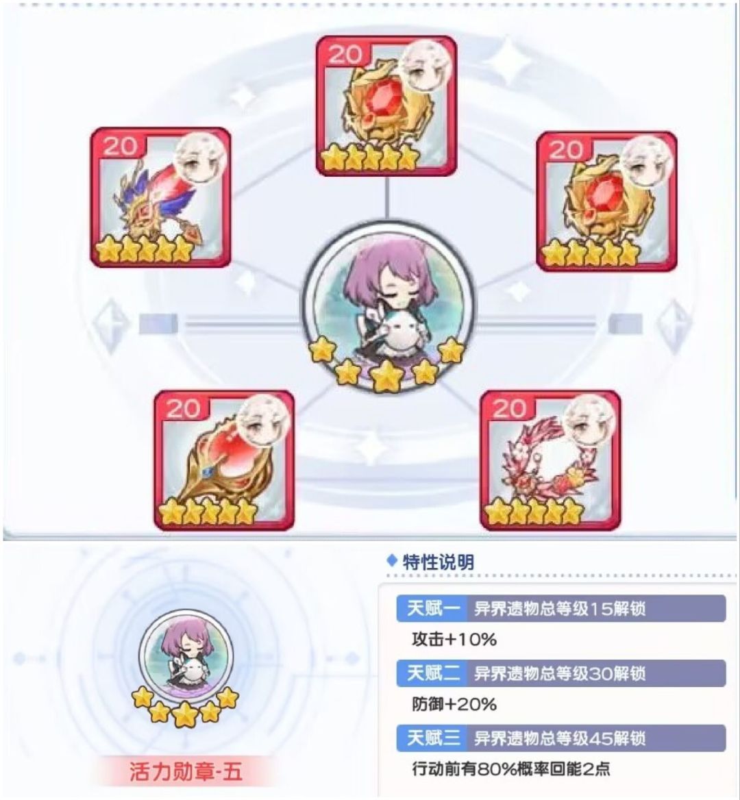 露妮娅的勋章陌陌这里只推荐活力勋章哈,不仅是因为它能带两个能量结晶(主词条为防御的遗物)和天赋二的防御加成,它天赋三赋予的回能效果也非常重要,露妮娅是没有自充能力的(自己给自己回能),所以需要借助外力,勋章就是外力的一种。