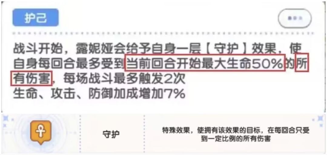 简单来说就是带悲叹印记,别人一回合直接伤害最多打你最大生命一半的血量,但我们的四星效果不一定是这么多,比如咱们没有带治疗少女,第二回合开始的时候露妮娅只有50%的血量,那这回合露妮娅最多只会受到25%最大生命的伤害。