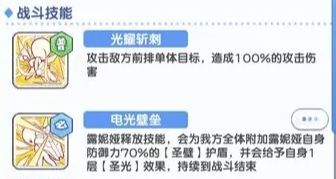 电光壁垒:露妮娅释放技能,会为我方全体附加露妮娅自身防御力70%的[圣壁]护盾,并会给予自身1层[圣光]效果,持续到战斗结束。