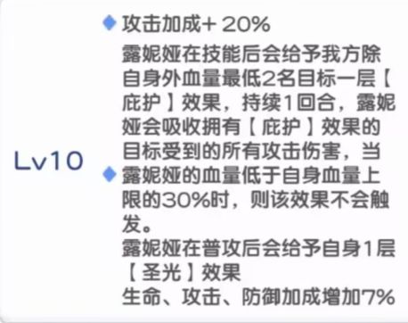 这个是露妮娅的心之所向二——末日的荣光十级的效果,比二星多了个普攻会给自己叠加一层【圣光】效果,可以说是锦上添花,有点用,但不多,面对有高减能的对手,可以让露妮娅平平无奇的普通攻击加点东西。