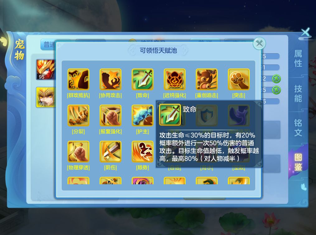 4)致命:已重新进入宠物天赋池。效果调整为攻击生命值较低目标时,有概率额外触发一次50%伤害的普通攻击。