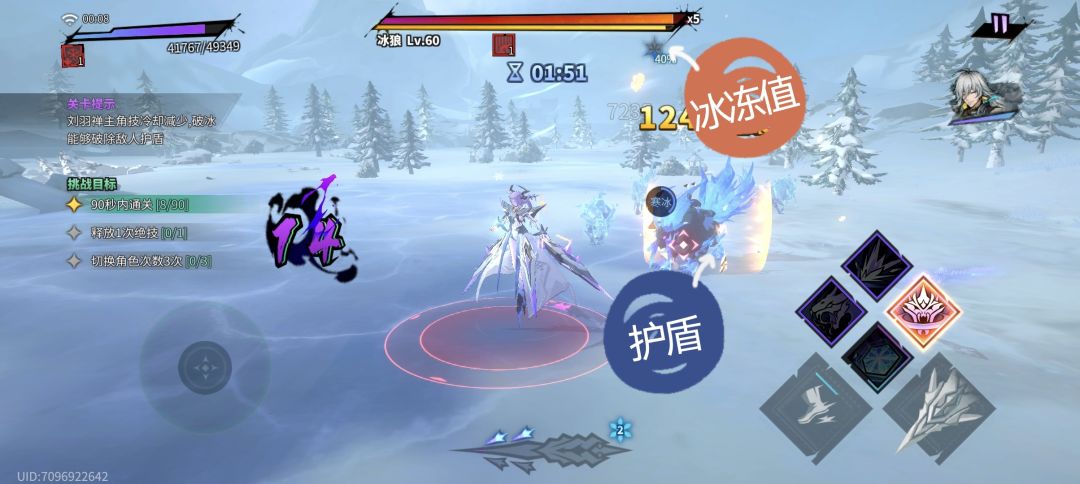 刘,雪双人关卡。这关主要难度在破冰,部分怪身上有护盾,需要冰冻值达到100%后,冰住怪物,打破冰伤害才能消除盾。