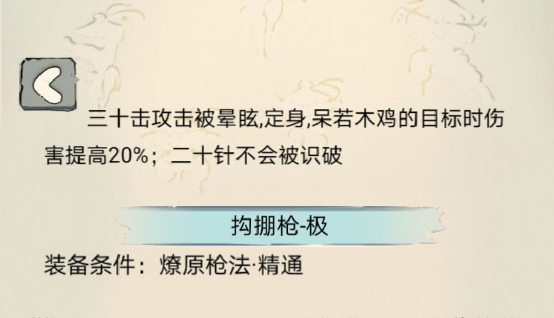 【二十针】:造成少量伤害,命中较高,同时“点穴”对手3回合。(①“点穴”效果类似眩晕,不可行动。②回合数与江湖经验有关,一般pvp玩家为2回合。③二十针后使用三十击增加伤害。)