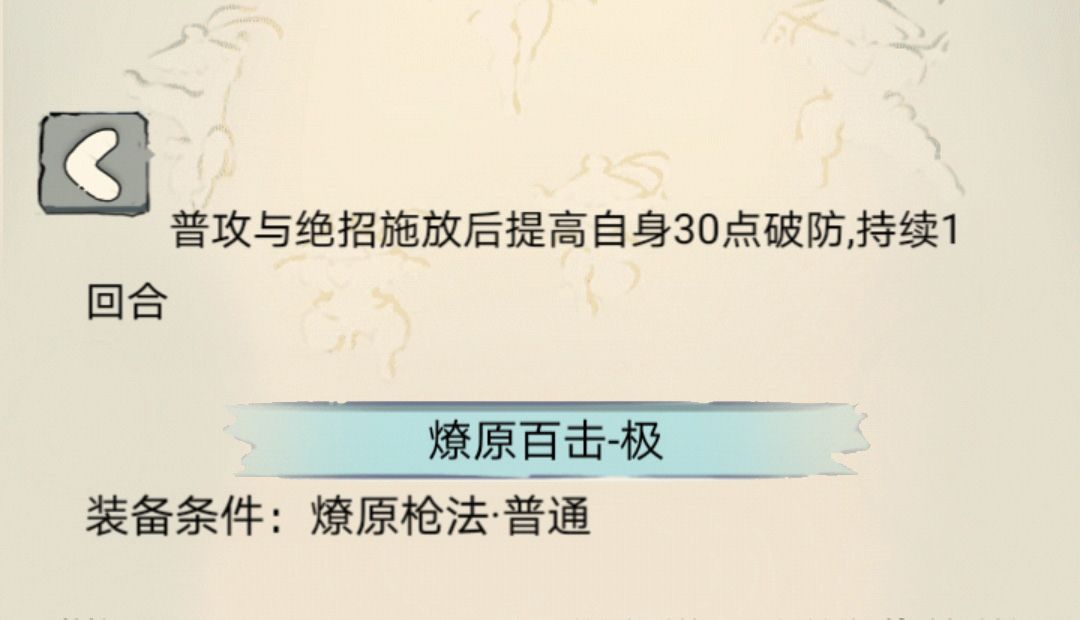 简介:出自神秘门派邪异门的武功,但却是天下间最为威猛的枪法枪势一往无前,招式延绵不绝,一旦使出仿佛燎原之火,烧向对手,难以招架。可解锁4个招式。