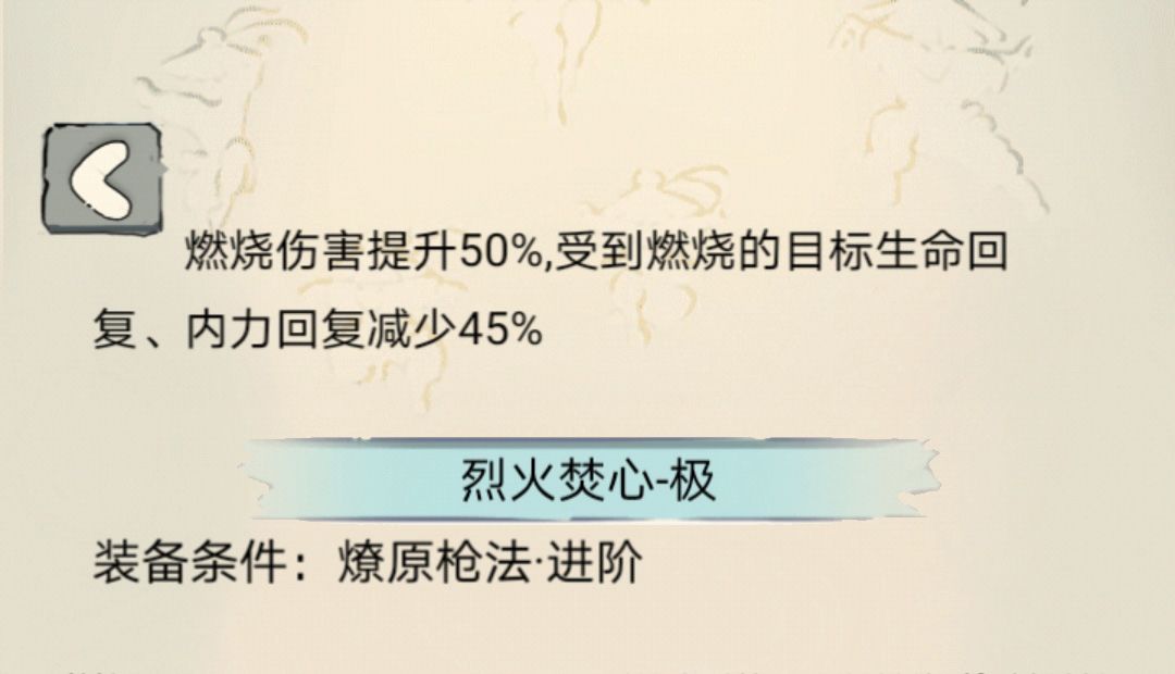 【三十击】:直伤绝招,伤害在绝学中一般,命中目标有几率产生“灼烧”效果,持续3回合。(①“灼烧”效果每回合掉血。②测试大佬400级燎原每回合只掉39点血,但大佬是身法加点,不知道掉血伤害是否和根骨挂钩。③暂时不知“灼烧”几率是否与等级挂钩。)