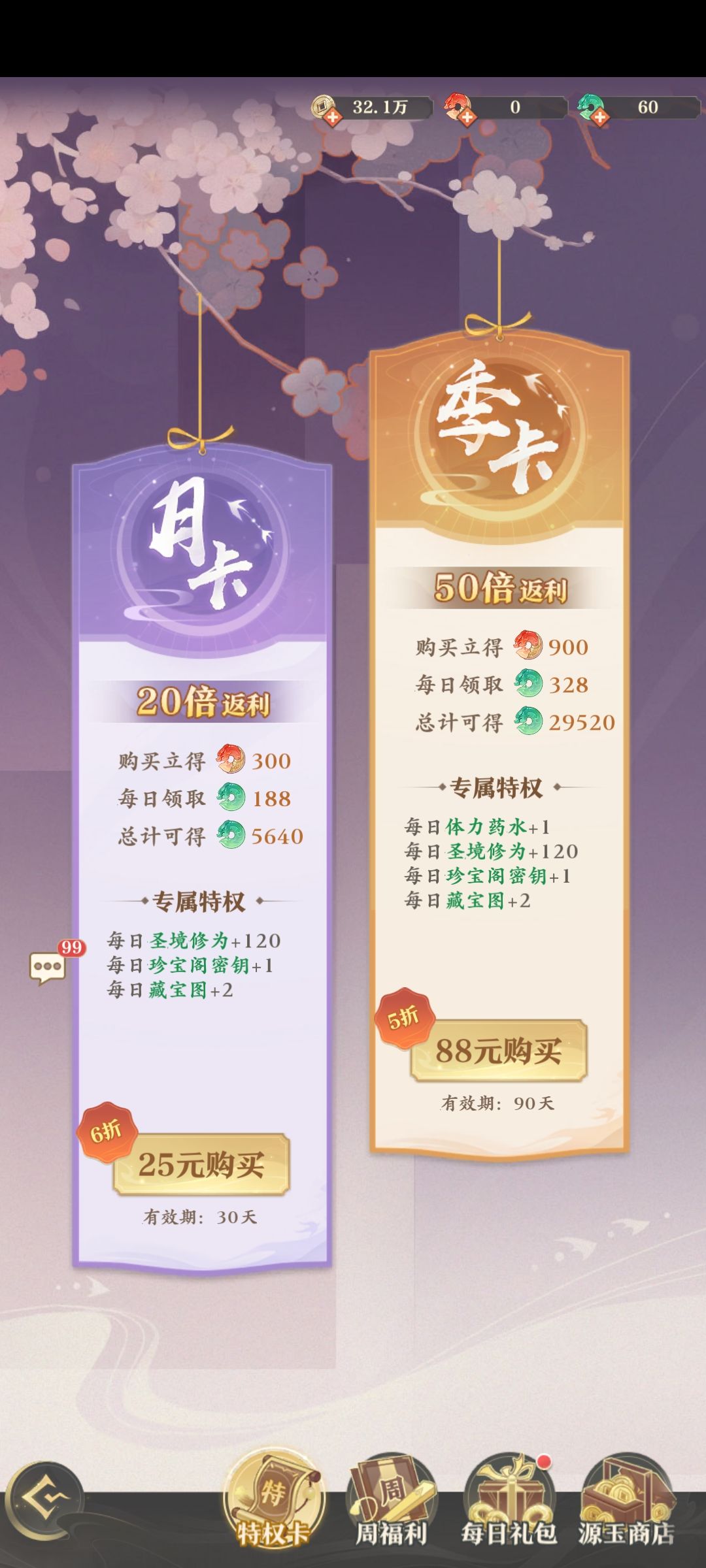 当然最划算的方案就是买季卡以及月卡,每天可以获得240的圣境修为的同时可以获得2个珍宝阁密钥,每五天必获得一个绝世任选箱,另新增加了4个藏宝图奖励,缺少蓝花和紫花升级资质的都可以去抽取获得