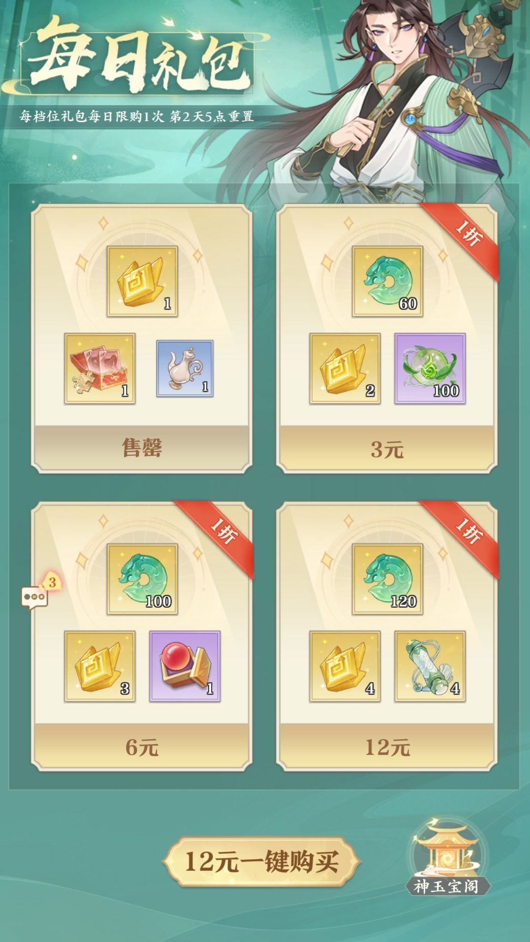 个人建议大家都去买每日礼包,只需要花费12元,每天可以获得10个神玉,每4天就可以去兑换2个苍穹碎片,八个苍穹碎片只需要192元,对比648的礼包,足足节省了70%的价钱!!!
