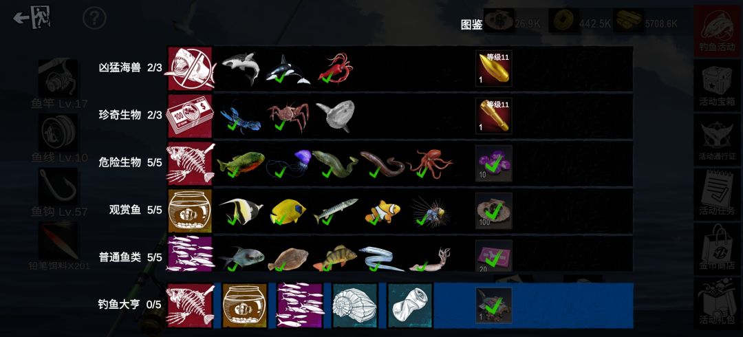 图鉴解锁奖励,解锁某种鱼后点击图标不但可以查看该种鱼售价,还可查看该种鱼钓起次数以及最长尺寸记录。解锁某种类型全部鱼后,可获得相应奖励,包含营地建筑外观。