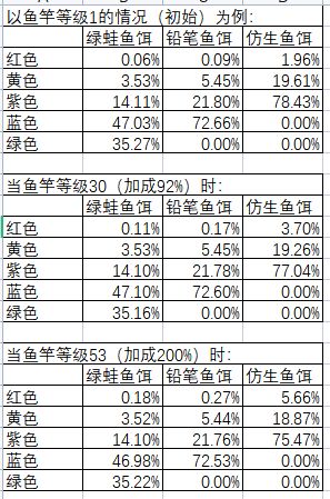 2、根据鱼饵类型不同,各种品质钓起来的概率: