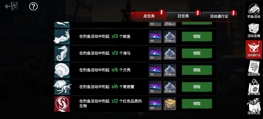 钓鱼奖励共分四部分,通行证奖励,图鉴解锁奖励,钓鱼宝箱奖励以及鱼王排行榜奖励。