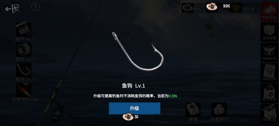 鱼钩升级的作用是提高本次钓鱼不消耗鱼饵的概率,此功能对所有鱼饵有效,普适性高,可以考虑优先升级。