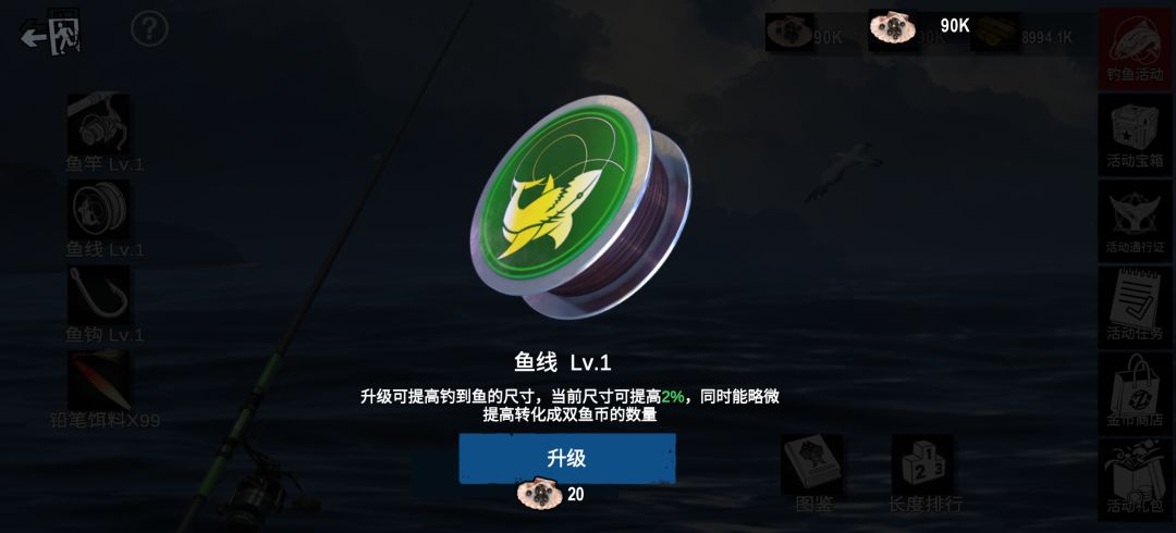 鱼线升级的作用是提高鱼的尺寸,尺寸提高后,出售鱼获得的双鱼币也有一定提升,但增长幅度较小。所以如果不追求排行榜,鱼线可以先不升级。