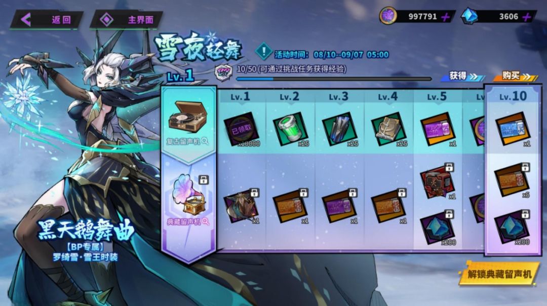 活动开启时,免费解锁【复古留声机】。开启【典藏留声机】后可解锁额外的奖励线并立即获得「罗绮雪·雪王」专属时装「黑天鹅舞曲」!四通实在好得不行了啊啊啊!