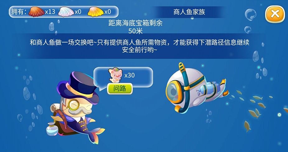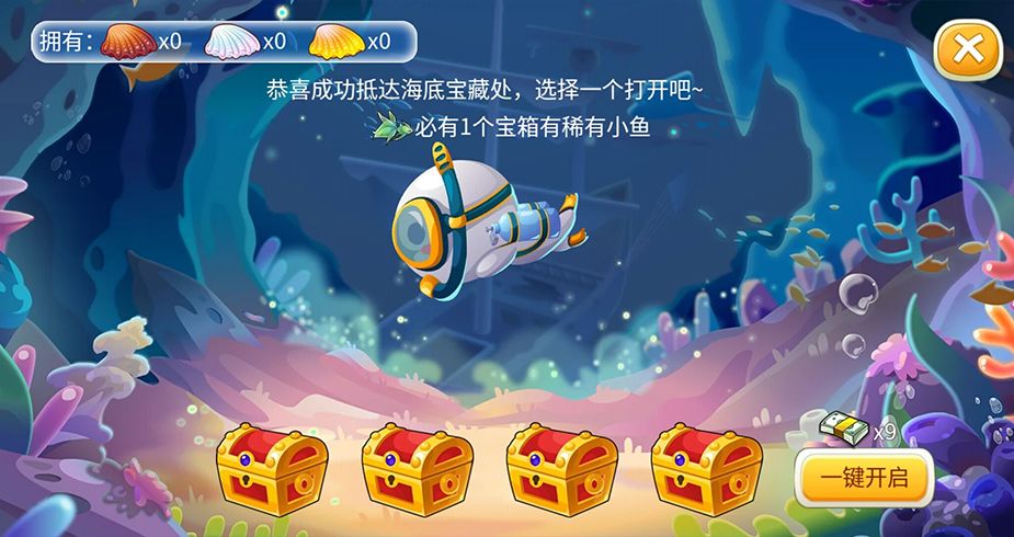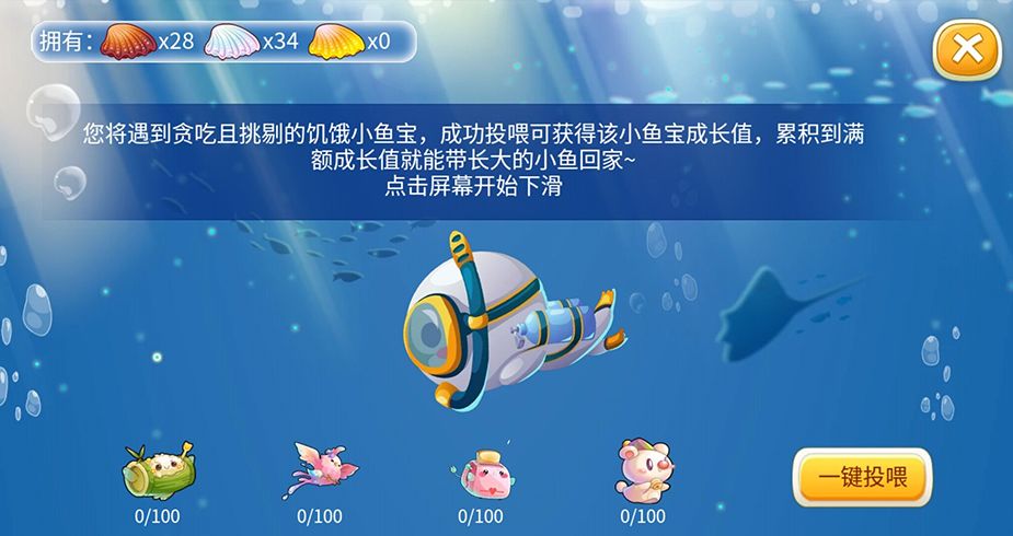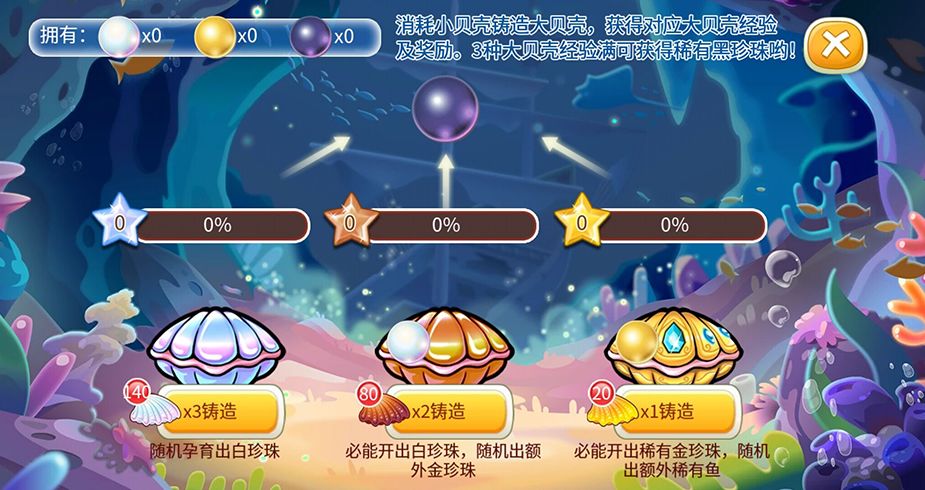 选择不同的小贝壳进行铸造大贝壳的任务。注意,这里有等待时间,请鱼友们及时将贝壳使用掉哦!获得珍珠后就可以到奖励兑换处领取潜水鱼啦~