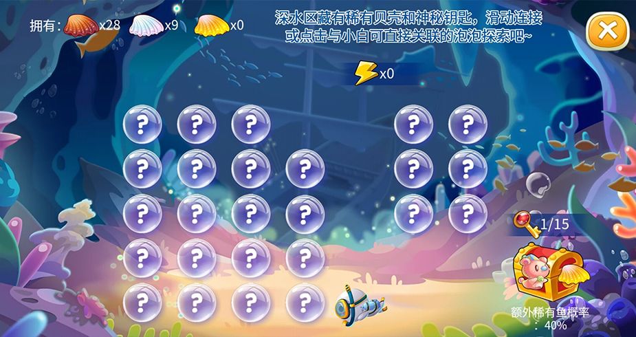 完成浅水区任务后,成功进入深水区。滑动连接泡泡进行探索,一次多连一些泡泡,快速完成任务!