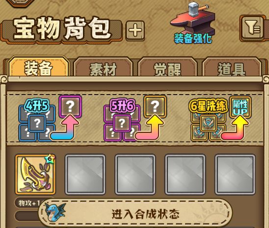 背包可以查看获得的道具,装备,素材,点击图标即可查看对应的属性或者获得方式,同时还可以在背包经行装备的合成,升星和洗练。