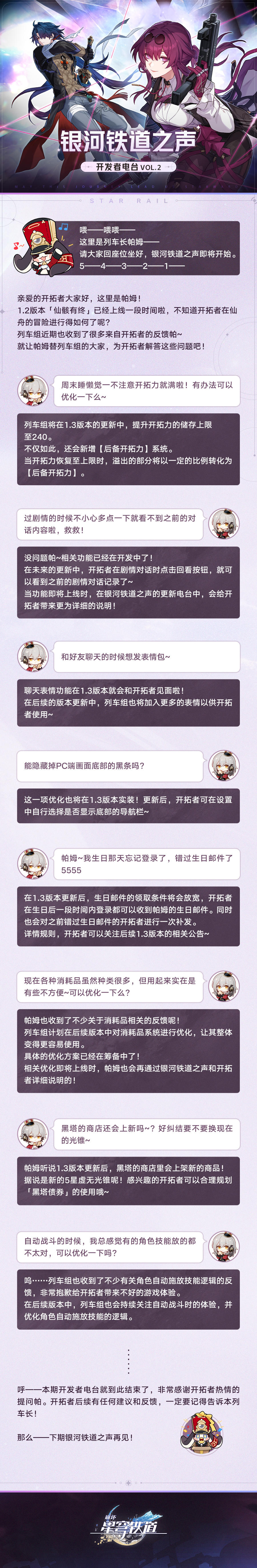 列车组近期也收到了很多来自开拓者的反馈帕~