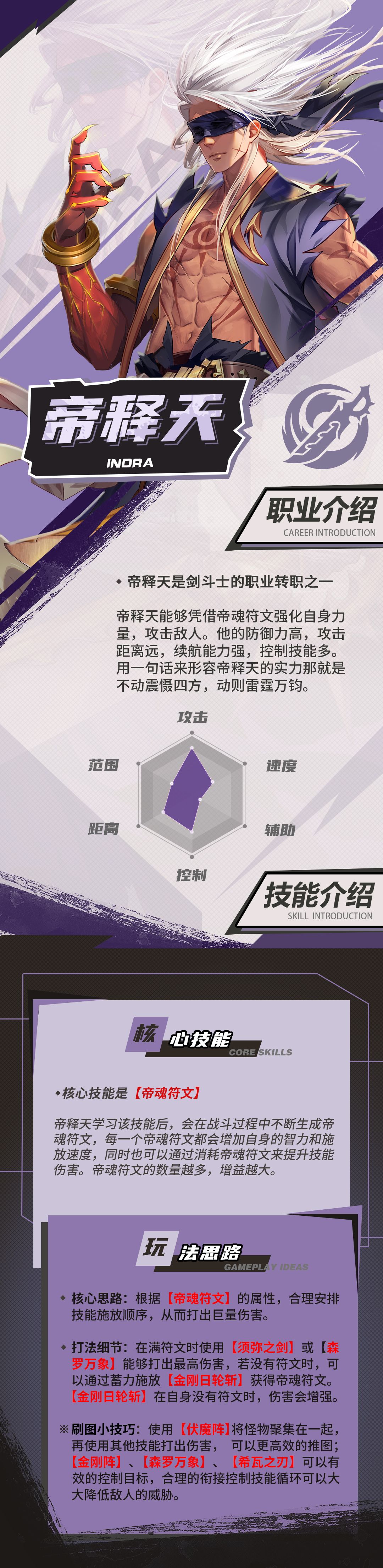 『帝释天』是剑斗士的转职之一,与其他剑斗士转职不同的是,帝释天擅长操控符文造成魔法伤害。防御力高,攻击距离远,续航能力强,控制技能多。用一句话形容这个职业那就是不动如山,动则雷霆万钧。