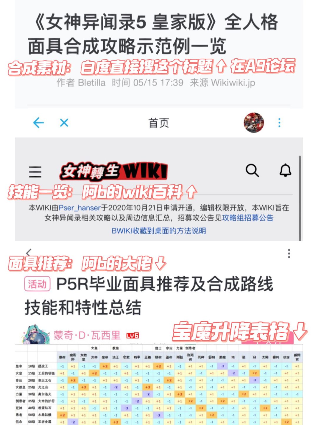 举例,面具合成路线【我手里有亚森(愚者),想得到男梦魔(恶魔),那么:亚森(愚者)➕皮克西(恋爱)=阿珈西翁(战车),而战车➕死神=恶魔)】