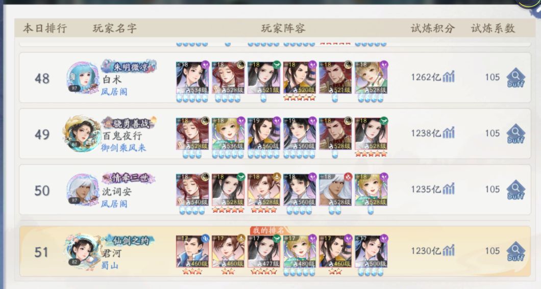 奖励的获取比例对低氪玩家还是很友好的。首先奖励的大头在签到,只要参与活动即可拿到。哪怕比拼排名的个人积分和仙盟积分,奖励差距也很小。除了前3名的奖励稍多以外,其余排名的奖励差距在10%左右。所以佛系玩家甚至都不用研究试炼内容,每天上去随手打一打就行。但若想打出一个好成绩,就不能三天打鱼两天晒网,每一天都得努力刷到最高分才行。毕竟计算的是7天总和,每一天的成绩都很重要。