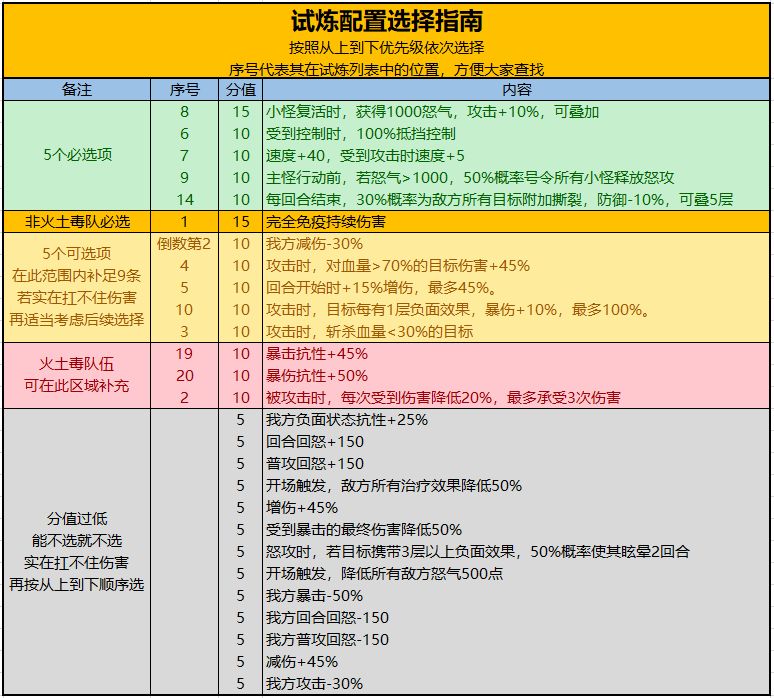 试炼配置的选择优先级,已经在总结的一图流里展示的很清楚了。这里就简单解释一些要点。