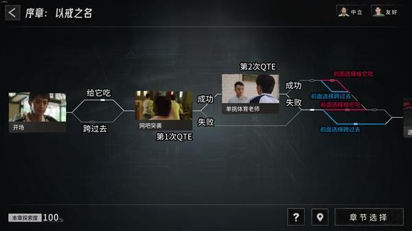 ★两次QTE都成功后剧情有2个分支,若0.1章节选择给它吃为上线(额外播放一段狗狗的视频),选择跨过去为下线(无事发生)。