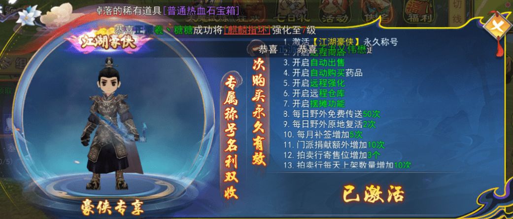 热血江湖手游是一款非常受欢迎的手游,不仅是一款经典的回忆,更是一段青春的燃烧.你可以通过一些小额的充值来获取游戏内的虚拟物品或者提升游戏体验。以下是一些建议:01首先建议大家获取侠名,侠名在游戏中的重要性不可忽视。即使没有首冲、周卡或月卡,拥有一个侠名也是至关重要的。