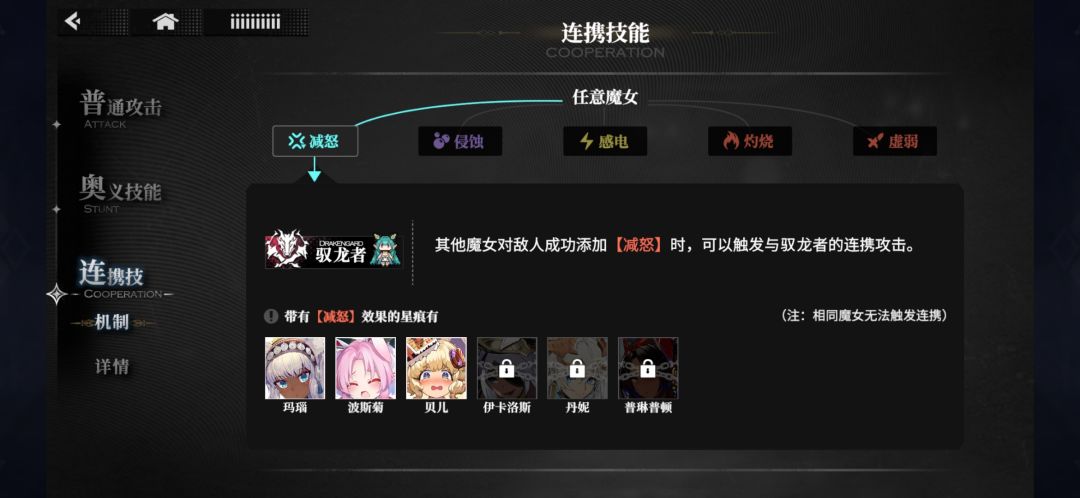最后,连携技的上限其实会随着魔女技能等级提升一直拔高,个人认为是玩到后期都非常强力的流派。甚至我认为,这才是这个游戏设计的核心思路(个人再说一句,那个奥义技就是歌姬)。大家也可以把其它负面考虑进来,我这个应该是比较低成本的了。