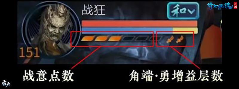 “战意”是【战狂】最具特色的一项战斗机制。战狂通过指定技能命中敌人可以积累战意,当战意达到一定点数,则可以通过另一些技能消耗战意,使伤害增加,战意上限固定为6点。【战狂】的核心技能为:【当康·击】、【金乌·芒】、【英招·杀】和【重明·斩】,可通过对应技能增加战意或造成额外伤害。当战意达到6点上限时,可以一键积累战意和消耗战意。