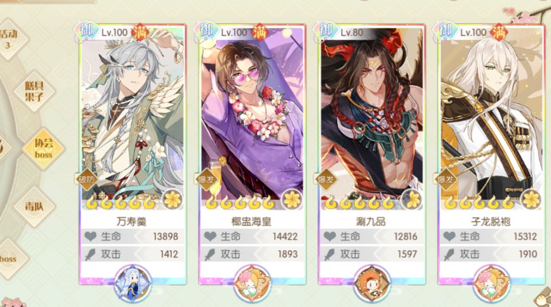 注意事项:看到仙女的大招好了放奶鱼的大招,因为每回合都要有增益buff要腰子再找个群体增益食魂推荐饺子,混排名随便打打就行,一般很低伤害就能混榜新出的boss很多人都没凑齐队伍