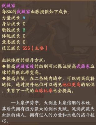 先来了解一下氏族血脉成长的侧重点。武藏家主要侧重于技艺的成长。