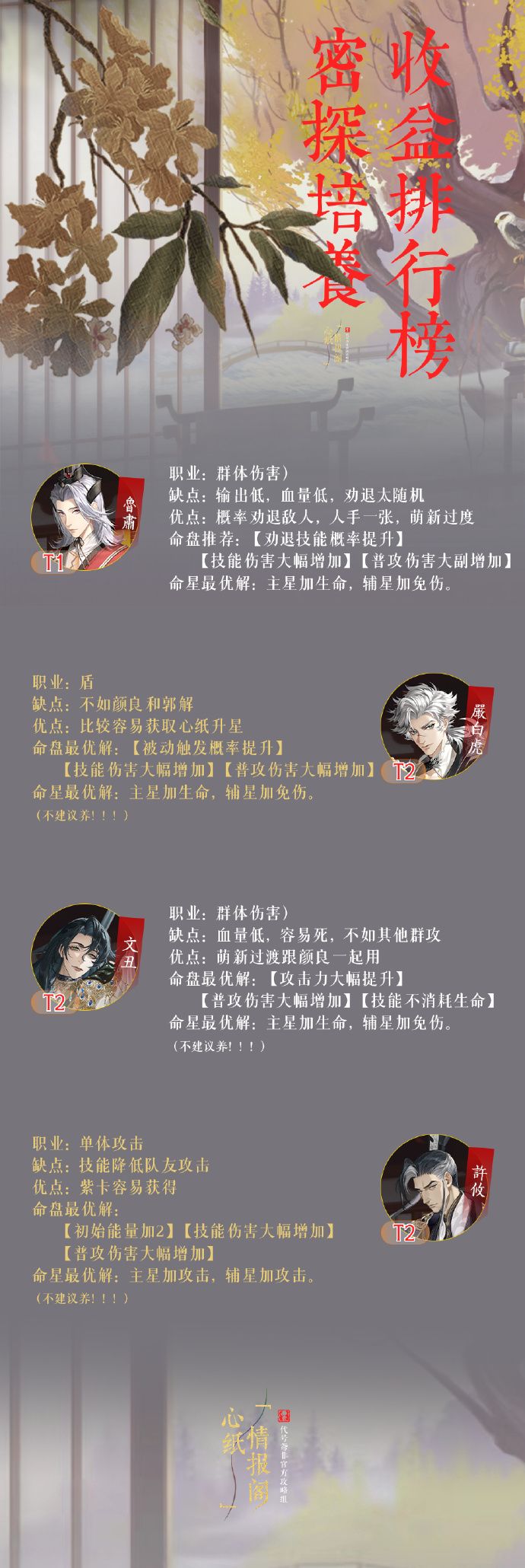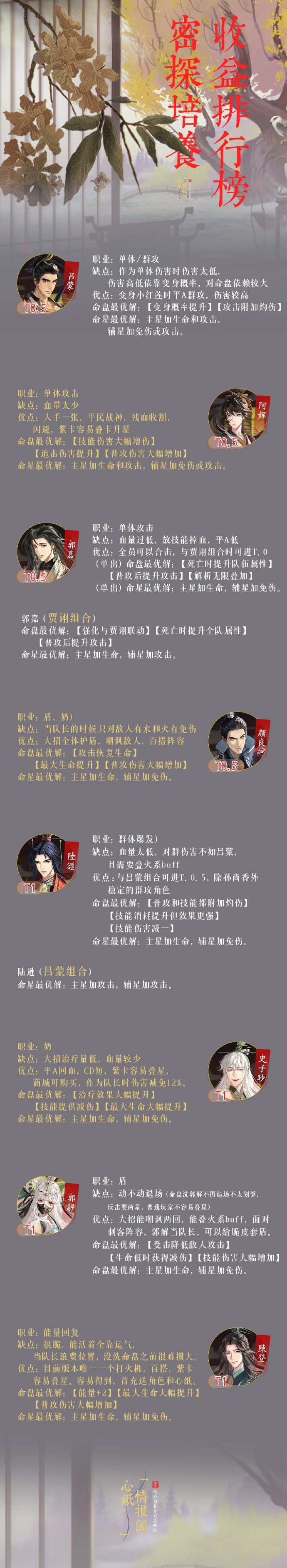 仅作为密探0星时培养收益高低进行排名,普通玩家资源有限,请合理安排资源,保证收益最大化;