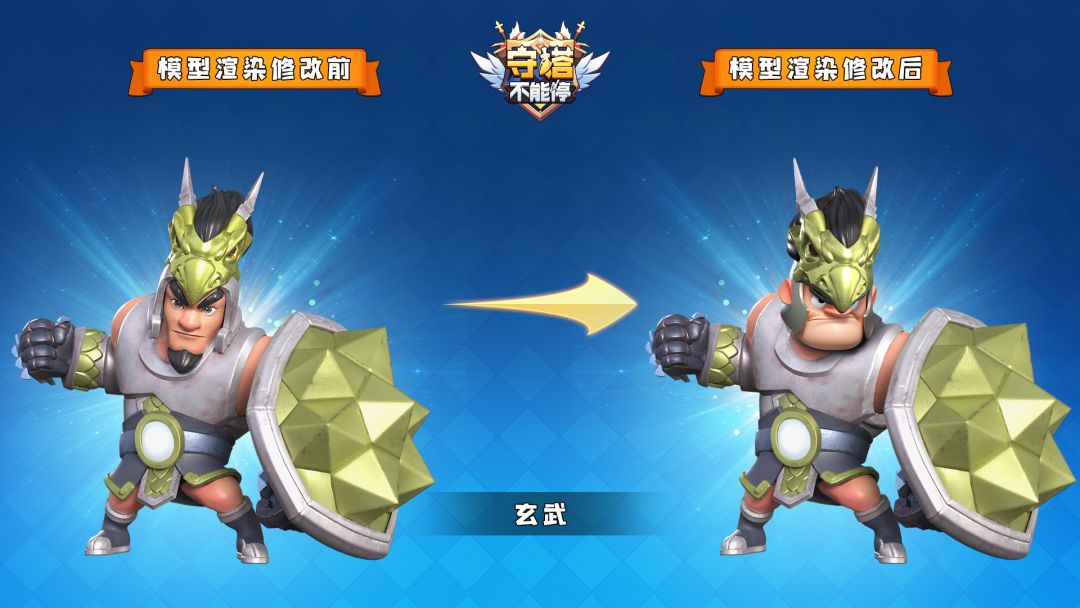 玄武的心想改变主要体现在面部塑造上,提到玄武往往都会联想到厚重感、强力的防御,这一系列让人感到安心的词汇。旧版形象虽然也是一身肌肉,加上英朗的造型线条,但是这脸部造型瘦瘦的总还是感觉有些不对。而新版造型的面部设计,采用宽厚的下巴,更加坚定的眼神,衬托着整体感觉都更加厚重了几分。