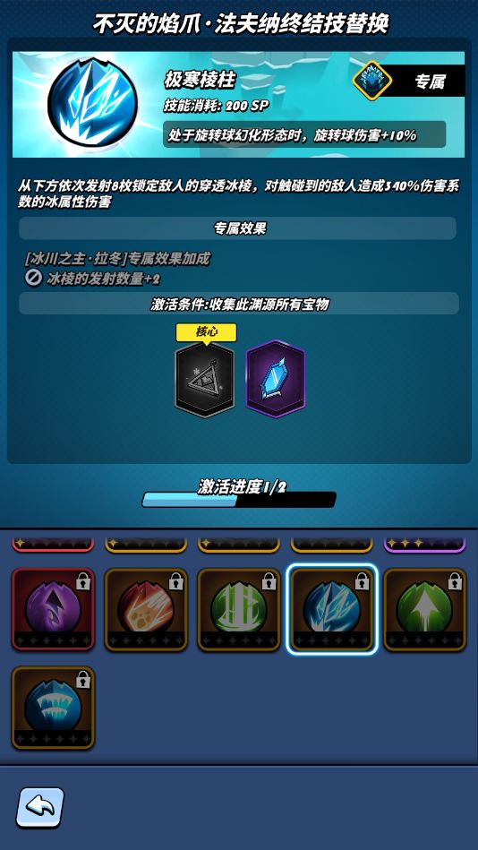 【终结技激活】例:收集并激活对应宝物配方中终结技“极寒棱柱”的对应宝物“预言护符”“魔镜”,即可激活“极寒棱柱”。