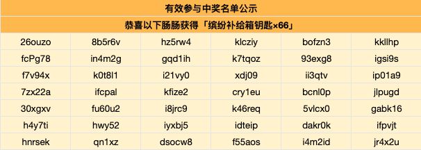 同时蛋卷将随机抽取36名有效参与活动的肠肠获得:缤纷补给箱钥匙×66