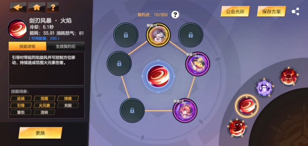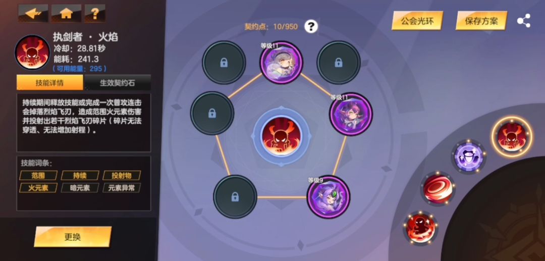 我选择了唯一有火元素关键词的执剑者,玩其他契约石可以按照需求换,这个技能选择比较灵活;