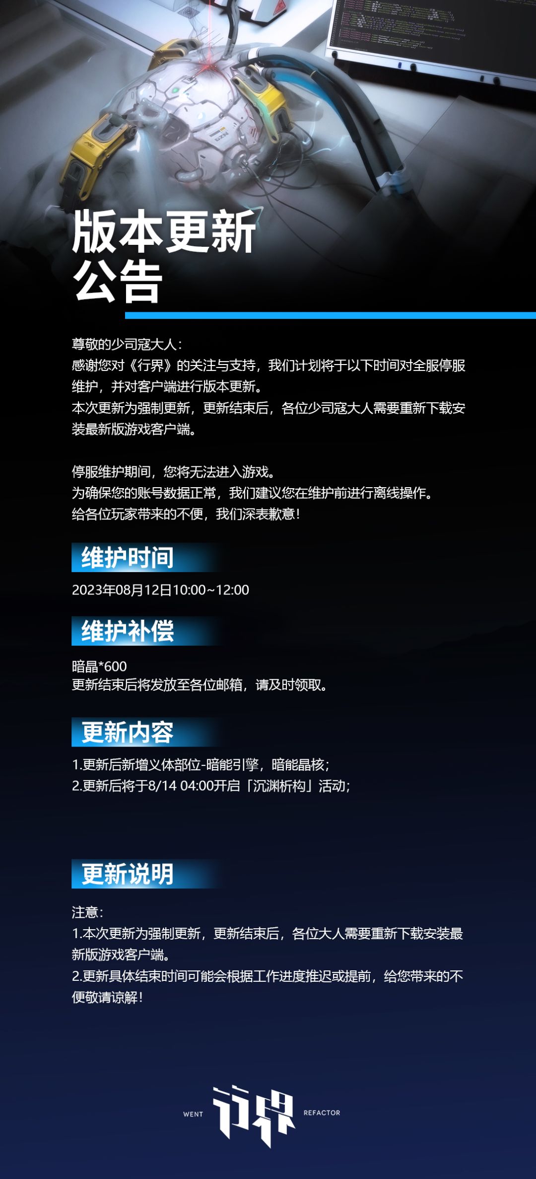 感谢您对《行界》的关注与支持,我们将于以下时间对全服停服维护,并对客户端进行版本更新。