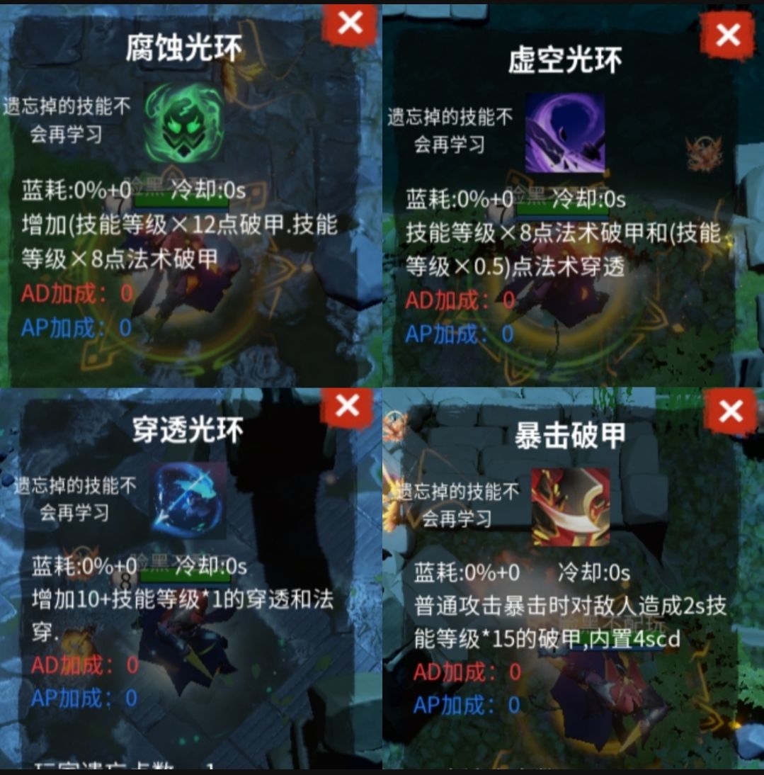 穿透破甲技能整局必备的技能,有3种搭配。穿透光环和腐蚀光环(简称双穿,百搭) 暴击破甲(只能玩暴击流,配合属性附加或者阿瑞斯光环才能用) 虚空光环(玩法术类型的技能才能用)
