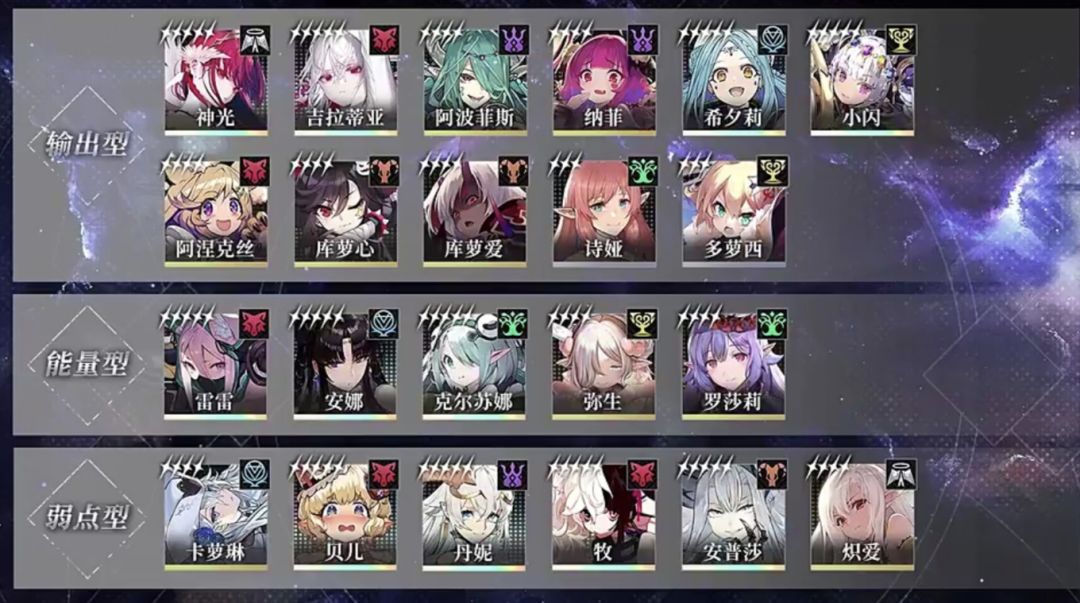 星痕分为三类:输出型、弱点型、能量型。输出型技能伤害倍率高,弱点倍率较低,升级只提升技能倍率;弱点型技能伤害倍率较低,弱点倍率高,升级同时提升技能倍率和弱点倍率;能量型主动技能通常带有能量回复效果,升级同时提升技能倍率和获得能量数值。