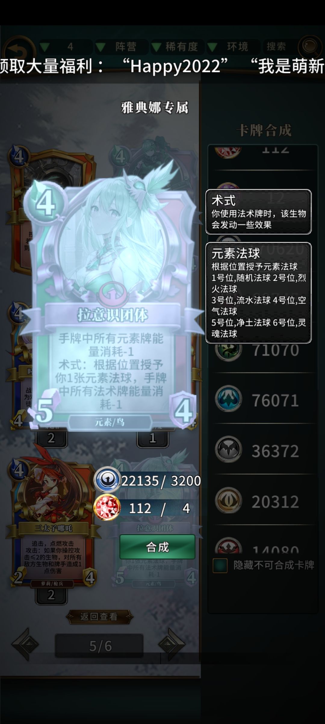 以前鸟遇到女王古神和白古神无从下手,现在可以用免费的4号位空气法球让他回牌库。以前打到中期遇到谎言之神和海拉没办法,现在也可以用5号位的厚土法球封印掉。如果没有生物需要你解,那么可以2号位一直刷直伤,如果对面是速攻,那巧了,6号位的灵魂法球可以抓牌回血。对,就是回血,娜娜也有回血了耶!(๑• . •๑)