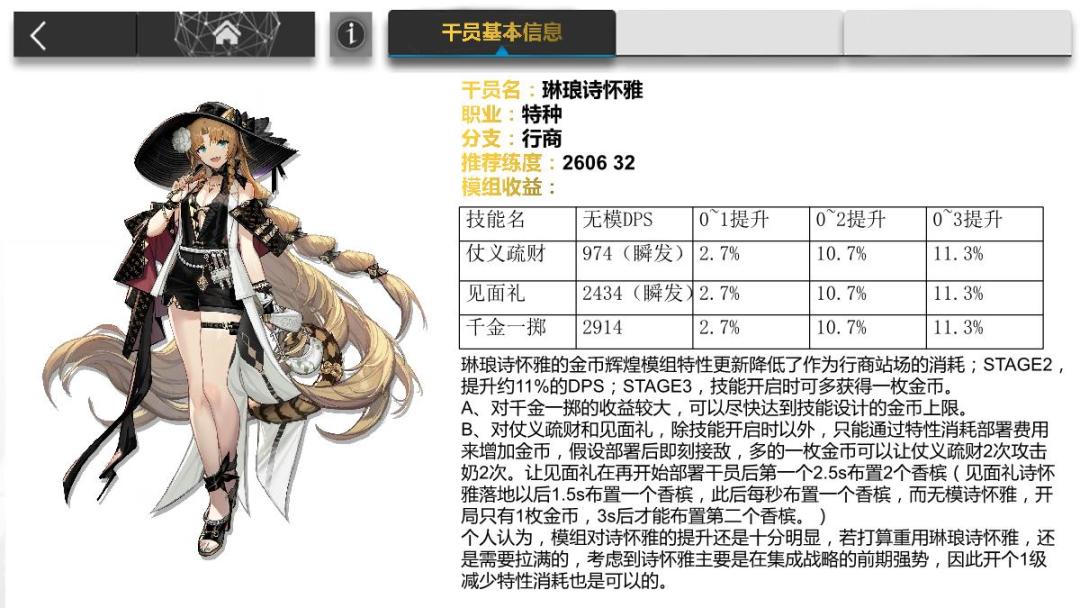 琳琅诗怀雅的金币辉煌模组特性更新降低了作为行商站场的消耗;STAGE2,提升约11%的DPS;STAGE3,技能开启时可多获得一枚金币。