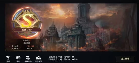 根据军团战力排名进行合理分配为四个战场,一个战场包含四个军团,活动入口在军团主界面,通过右侧按钮点击即可进入活动界面,活动开始时可直接通过主界面的活动按钮跳转进入活动。