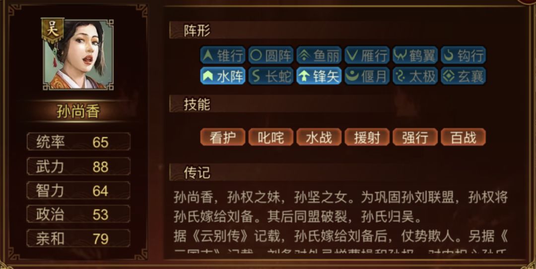 自从有了新神器,100武的孙夫人号称群雄输出第一远程弓箭手(满训),连珠5次、援射5次,枭姬主将,指挥所有女将进行一次伤害为70%的射击(射程内)。