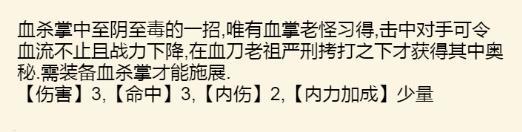 【蚀血掌】:造成一般伤害,同时使对手中“血毒”3回合。(“血毒”为每回合流失少量气血,且降低属性。)