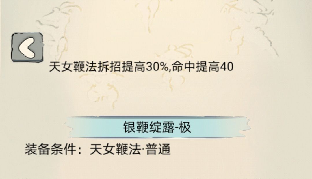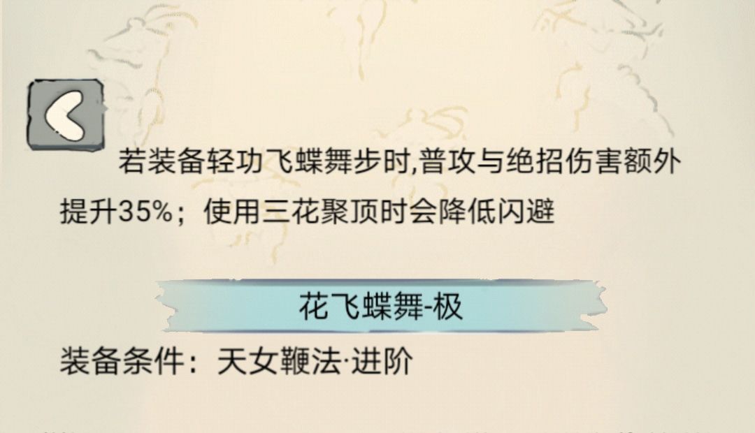 【武学评价】:目前唯二的鞭法类绝学,虽然与流星,玉女素心剑等同为身法绝学,但由于没有内功加成,所以伤害不理想成了天女鞭法的最大缺陷。同时双绝招耗内也比较严重,在因为配合三花的缘故持续战斗能力较差。pvp在绝学中中规中矩需要配合其他绝学才能质变,pve由于闪避高也还能看。