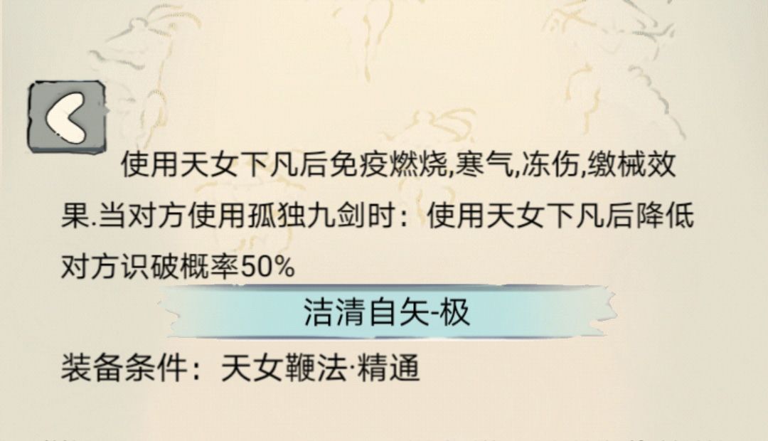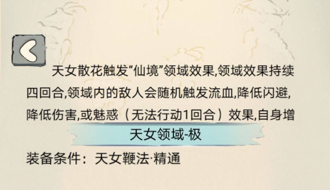 【天女下凡】:无伤害,类似三花加闪避、命中,但效果似乎弱于三花,同时该状态可增加天女鞭法约50%伤害。