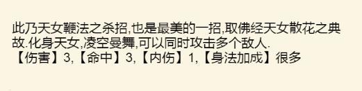 【天女散花】:普通直伤绝招,伤害还行。